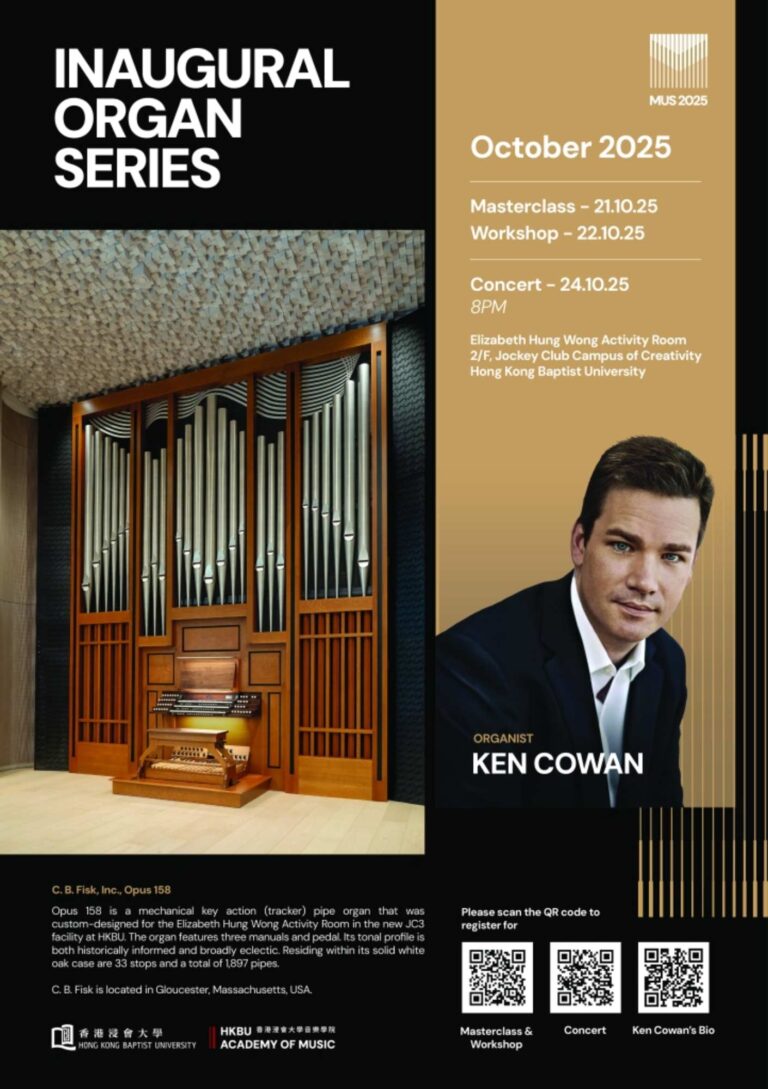 This special occasion marks the dedication of our newly installed C. B. Fisk, Inc., Opus 158 organ, which emphasises HKBU’s commitment to musical excellence and cultural enrichment. Organ maestro Ken Cowan will present a recital that promises to be both inspiring and memorable. We sincerely hope you can join us for an evening of exceptional music as we embark on a new chapter at HKBU.